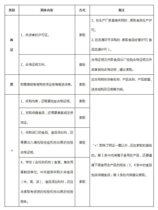 1、所謂“兩證一票+”即為:所有的食品(原料)等,采購(gòu)時(shí)均需索取兩個(gè)證和一個(gè)票。特殊的食品還要索?。锏膬?nèi)容。